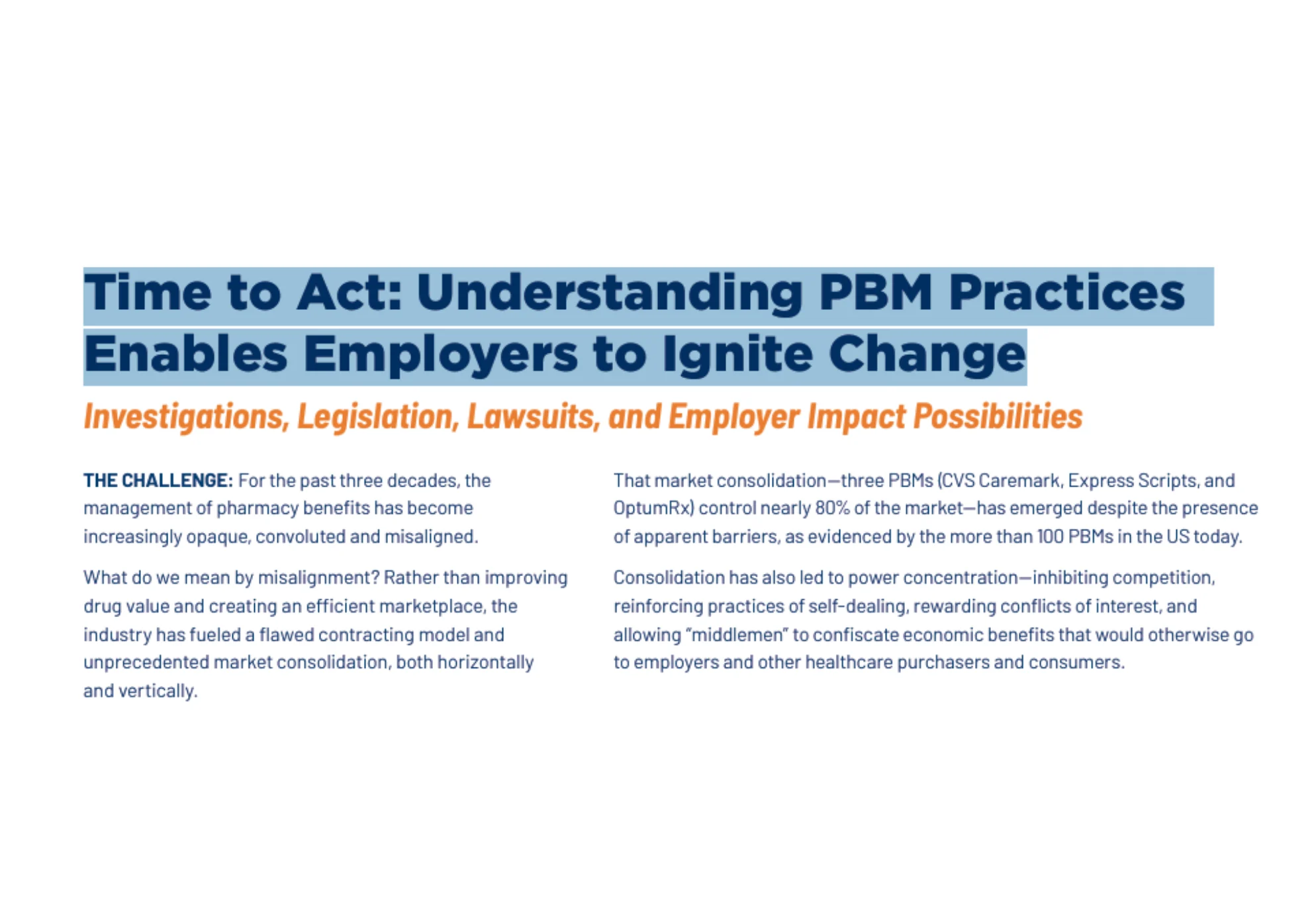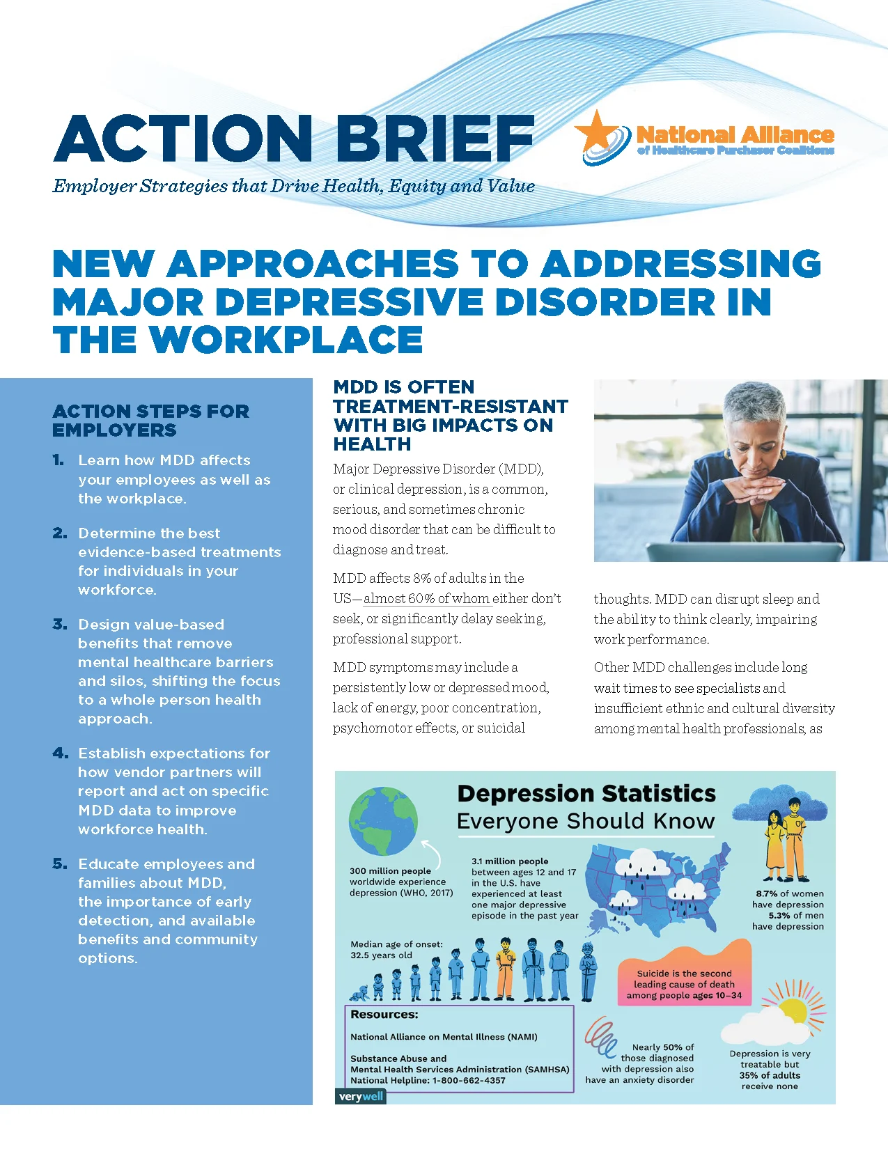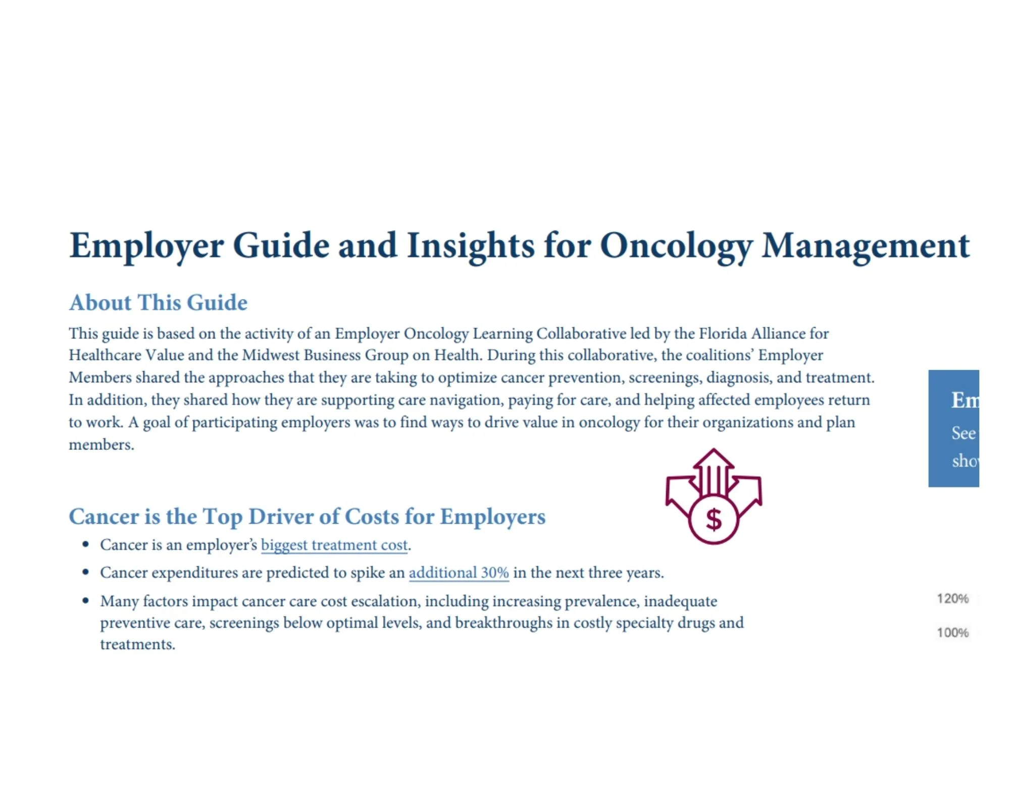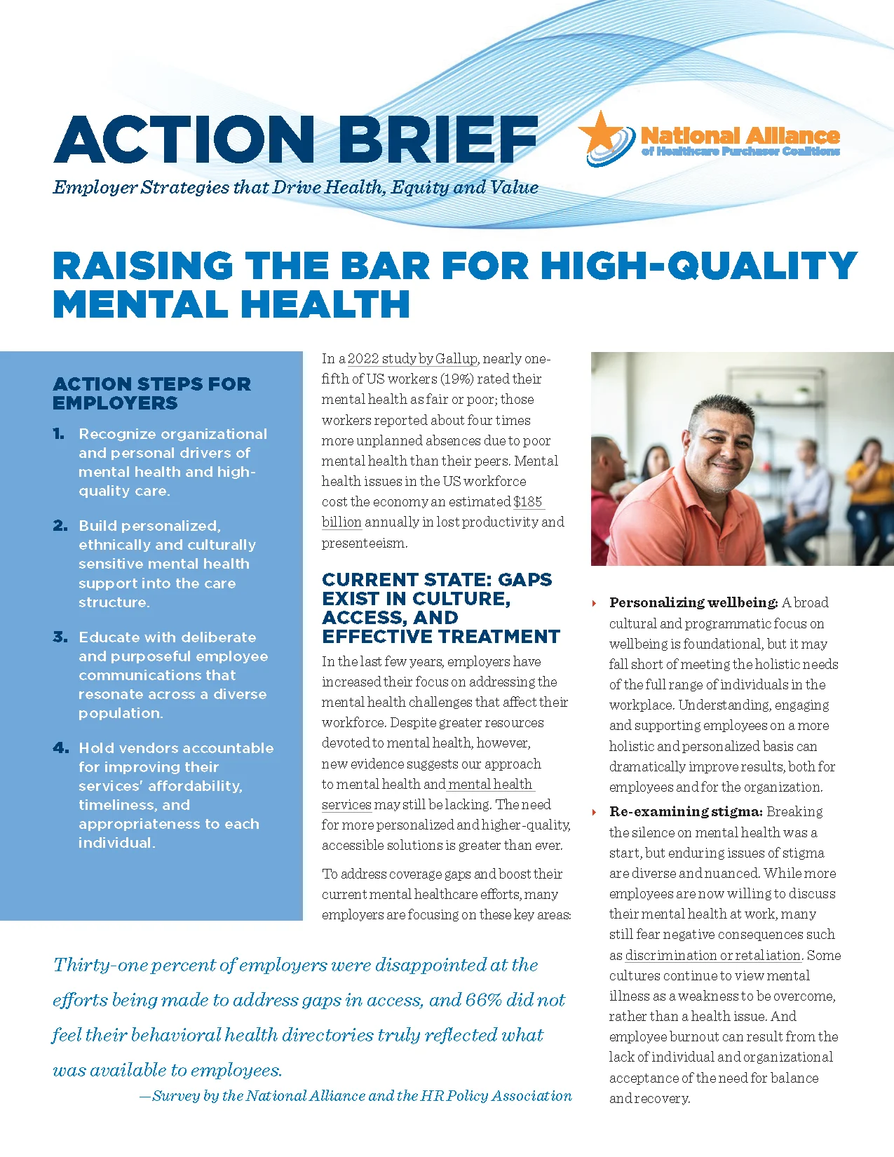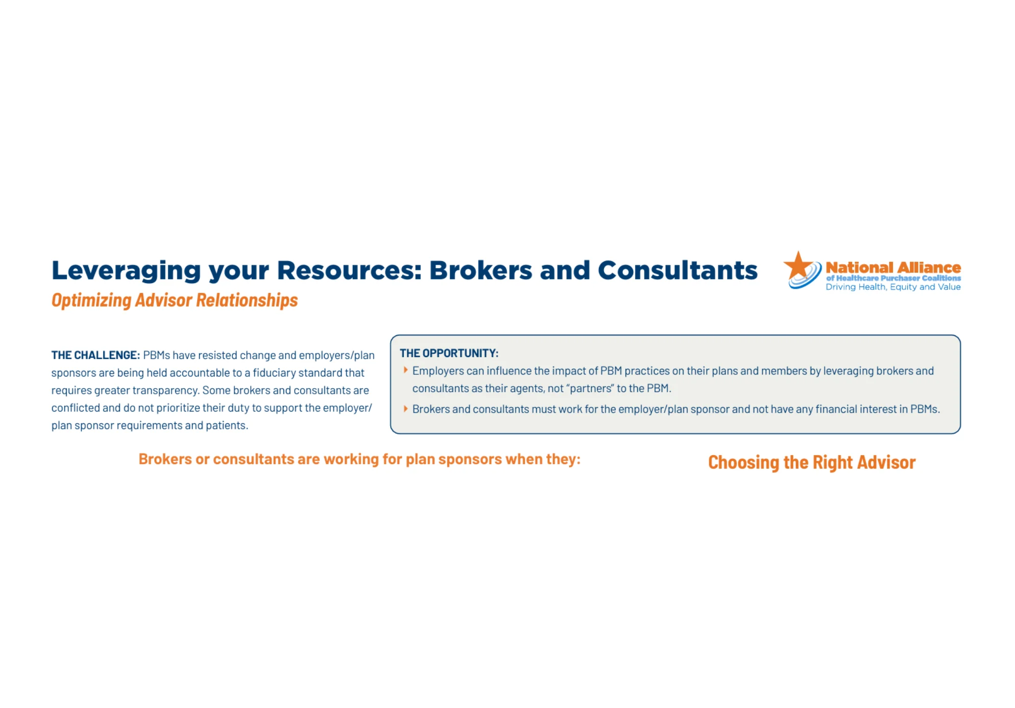 Employer ResourcesAll34Health Equity1High-Cost Claims3Hospital Fair Price4Mental Health6Medical and Pharmacy Drugs14Cell & Gene Therapy2Benchmarking0Diabetes0Hypertension0Oncology4 Jun 2, 2025 The National Comprehensive Cancer Network® (NCCN®) The National Comprehensive Cancer Network® (NCCN®) is a not-for-profit alliance of 33 leading cancer centers devoted to patient care, research, and ... DOWNLOAD Jun 2, 2025 Employer Guide and Insights for Oncology Management with Links This guide is based on the activity of an Employer Oncology Learning Collaborative led by the Florida Alliance for Healthcare Value and the Midwest Bu... DOWNLOAD May 27, 2025 Mitigating the Impact of Delayed Cancer Care: Timely Cancer Care Toolkit This toolkit represents an important, practical and comprehensive resource to increase understanding of choices ad actions Dallas Fort Worth area empl... DOWNLOAD May 27, 2025 Mitigating the Impact of Delayed Cancer Care: Employer Demonstration Project Case Study & Report Although, conceptually, employers and employees may agree on the value of timely, preventive cancer screenings, common sense does not always translate... DOWNLOAD Apr 8, 2025 PBM Misalignment Initiative – FINAL REPORT The National Alliance developed the PBM Misalignment Initiative to investigate and address misalignment between employers and their pharmacy benefit m... DOWNLOAD Mar 12, 2025 Cell & Gene Therapy Employer Toolkit-Benefits Design Checklist DOWNLOAD Mar 12, 2025 Cell & Gene Therapy Employer Toolkit-Understanding CGT DOWNLOAD Feb 24, 2025 New directions to better manage high-cost claims High-cost claims have become the single fastest-growing healthcare cost for employers in the last decade. Since 2016, the number of health plan mem... DOWNLOAD Feb 24, 2025 Leading by Example AND Moving Upstream Together A key issue facing the American healthcare system is the impact of social needs, social risks, and social determinants of health (SDoH) on healthcar... DOWNLOAD Feb 24, 2025 ACHIEVING VALUE MEDICAL SIDE OFDRUG BENEFITSA Deep Dive Powered by eValue8™ For years, experts have known that a significant part of drug spending occurs through the medical benefit. With the emergence of specialty drugs, the... DOWNLOAD Feb 24, 2025 Employer Rx Value Assessment Framework: Building the Bridge to Sustainability DOWNLOAD Feb 24, 2025 Opportunities in Pharmacy Benefit Management We’re delighted to share with you our “2021 Opportunities in Pharmacy Benefit Management.” The disruptions caused by the pandemic and social injustic... DOWNLOAD Feb 24, 2025 A Playbook for Employers – Addressing Pharmacy Benefit Management Misalignment For the past three decades, the professional management of pharmacy benefits has become increasingly opaque, convoluted and misaligned. Rather tha... DOWNLOAD Feb 21, 2025 MYTHS AND FACTS – Revealing Hospital Price Transparency Truths This “Myths and Facts” resource separates the business of healthcare from the delivery of healthcare. There is no question that hospitals are vitall... DOWNLOAD Feb 21, 2025 Beyond Hospital Transparency – Getting to Fair Price Hospital costs are one of the fastest growing expenditures in the US economy with employers and employees paying the highest prices in the world. T... DOWNLOAD Feb 21, 2025 Setting the record straight – The Urgency of Achieving Hospital Fair Price Two worrisome realities are all too common due to outrageous and indefensible hospital prices. Employees are being pushed into medical debt and forc... DOWNLOAD Feb 21, 2025 How the Advancement of Telehealth is Benefitting Mental Healthcare & Health Equity Health equity in telehealth is the opportunity for everyone to receive the health care they need and deserve, regardless of social or economic statu... DOWNLOAD Feb 21, 2025 Employer Guidebook on Mental Health & Major Depressive Disorder This guidebook is a resource for employers seeking to learn more about mental health and major depressive disorder (MDD). It includes an introductio... DOWNLOAD Feb 21, 2025 New Approaches to Addressing Major Depressive Disorder in the Workplace Major Depressive Disorder (MDD), or clinical depression, is a common, serious, and sometimes chronic mood disorder that can be difficult to diagnose a... DOWNLOAD Feb 10, 2025 High-Cost Claims Houston Employer Workshop Slides Final DOWNLOAD Feb 5, 2025 Prescription Digital Therapeutics Digital therapeutics (DTx) are health software intended to treat or alleviate a disease, disorder, condition, or injury by generating and delivering a... DOWNLOAD Feb 5, 2025 Rethinking How Employers Address High-Cost Claims High-cost claims have become the single fastest growing healthcare cost for employers in the last decade and were identified as one of the “most signi... DOWNLOAD Feb 4, 2025 Raising the Bar for High Quality Mental Health In a 2022 study by Gallup, nearly one-fifth of US workers (19%) rated their mental health as fair or poor; those workers reported about four times mor... DOWNLOAD Feb 4, 2025 Behavioral Health Vendor Engagement Template This Vendor Engagement Template (VET) supplements questions that may be included in ongoing mental health vendor management discussions. The goal is t... DOWNLOAD Feb 2, 2025 Equitable Access to Care for Mental Health and Substance Use Disorders: Nearly 15 years after the enactment of the Mental Health Parity and Addiction Equity Act (MHPAEA), inadequate access to timely affordable care continu... DOWNLOAD Nov 14, 2024 CASE STUDY: Employers’ Advanced Cooperative on Healthcare/Employers Choice Rx Coalition Profile Contacts: Keith Weigand (kw******@********er.org) and Bob McCollins (bm********@********er.org) The Employers’ Advanced Cooperativ... DOWNLOAD Nov 13, 2024 CASE STUDY: Neiman Enterprises Lowers Wasteful Pharmacy Spend by 75.8% Employer Profile Neiman Enterprises, a family-owned timber operation for four generations, opened its first sawmill in 1936 in Upton, Wyoming. It now... DOWNLOAD Nov